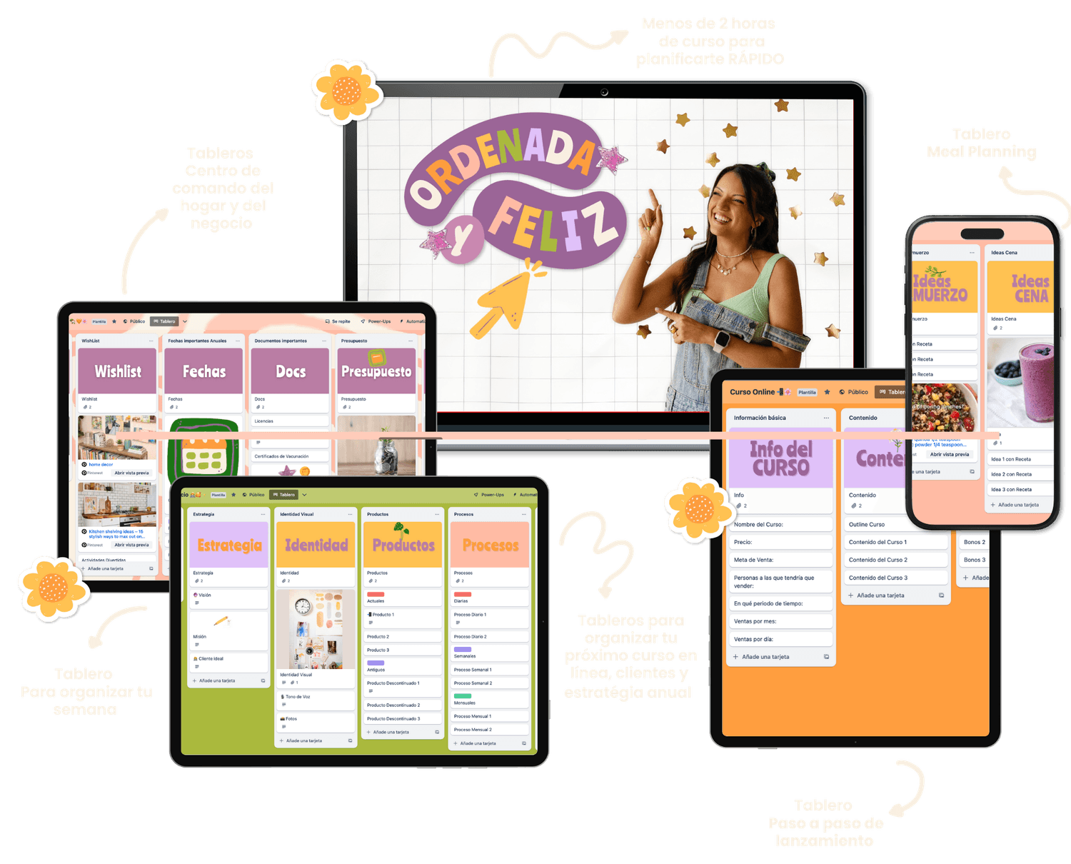 El curso Ordenada y Feliz Básico, es un curso en línea de organización, que con 8 tableros de Trello te enseñaré mi sistema de orden digital para organizar tu semana, todo lo que involucra al hogar, tu menú semanal, tu negocio, lanzamientos entre otros tableros. (Se enfoca en enseñar de Trello y como aplicar el orden en esta herramienta).