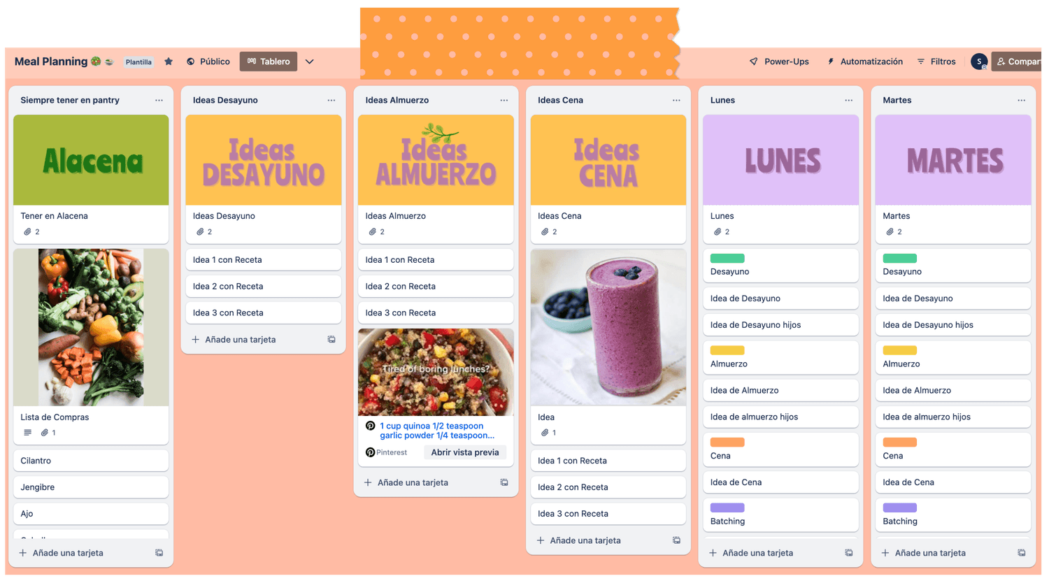 Plantilla de Trello "Meal Planning" para organizar tus comidas semanales $15 dólares